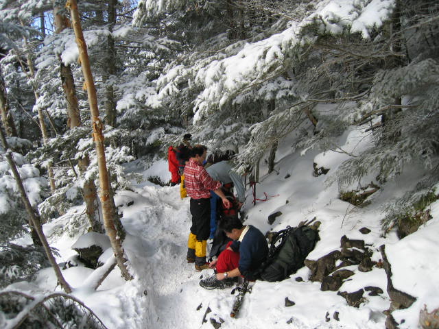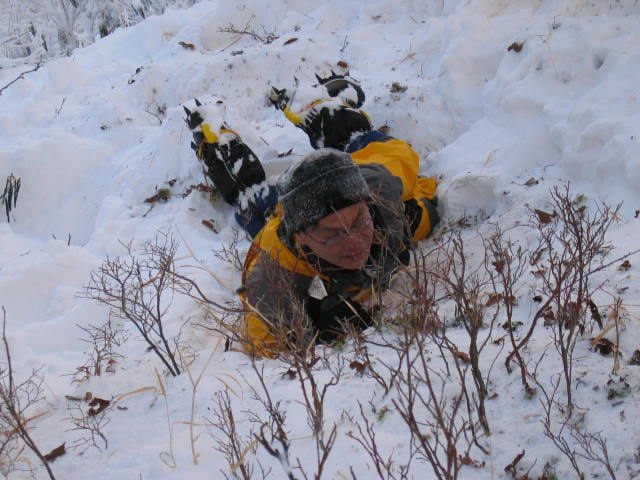 ![]() 行者小屋までの下りの途中で滑落停止の練習をしました。 雪が少ないので石ころが出てきてしまいました。滑落停止のように締まった雪が多くないとい けない習は3月末の雪上訓練でまとめて行うことにしましょう。 、 |
