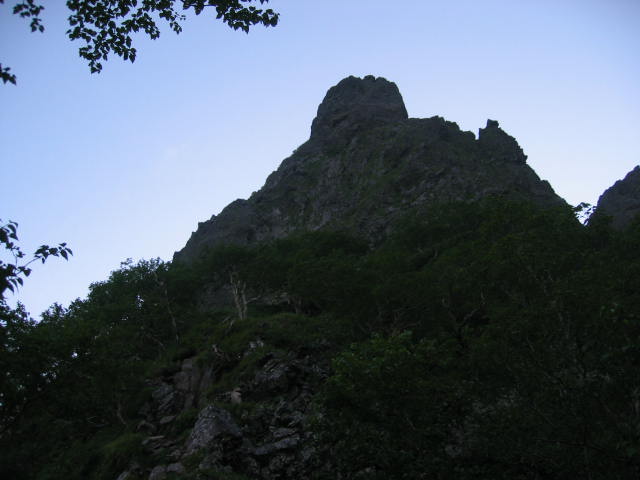 早朝4時に赤岳鉱泉のテント場を出発して大同心稜を登る、 明るくなってきて目指す小同心が見えた。 、 |
