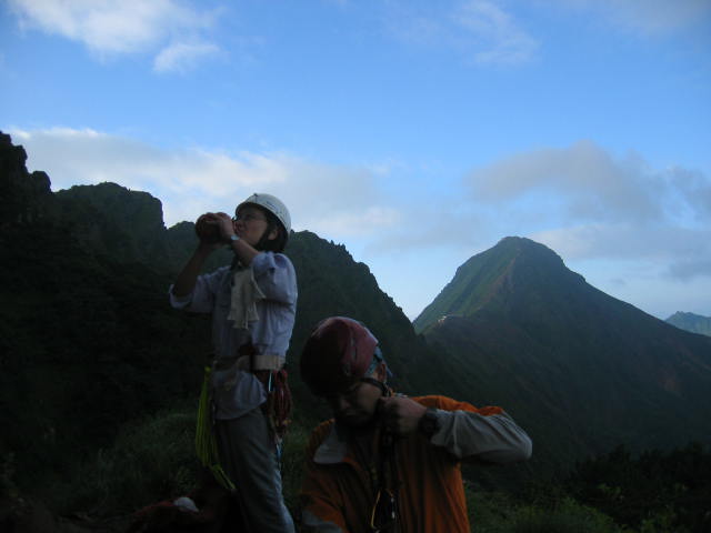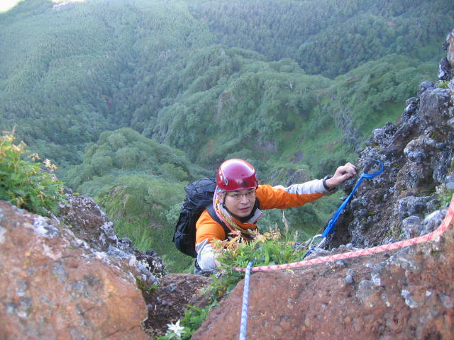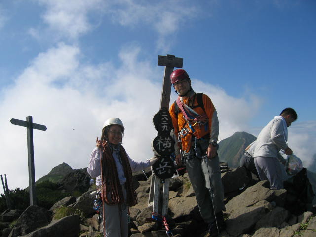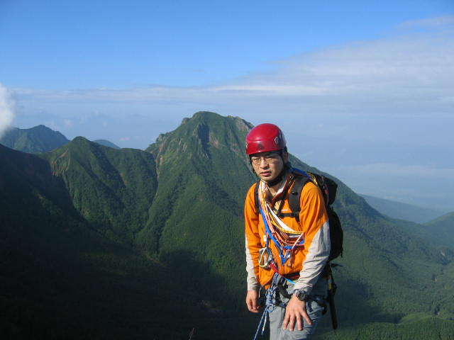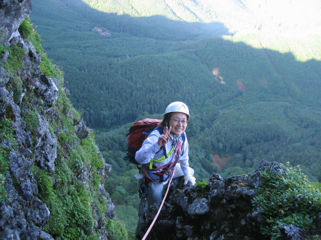 頂上の標識にセルフビレーをとり(写真の中央下にスリングが写っている)セカンドを向かい入れて登攀が終了、頂上で握手して記念写真をパチリ。古い山岳会出身のMさん(写真左)が繰り出すいくつかの伝統的な所作はクラシックルートのクライミングに溶けこんで演出しさらに魅力的なものにしてくれました。 、 |