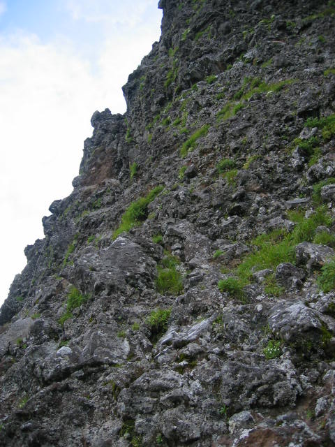 大同心稜から小同心稜へ岸壁の基部をトラバース、見上げれば手つかずの岸壁群が行く手をはばむ。 、、 |
