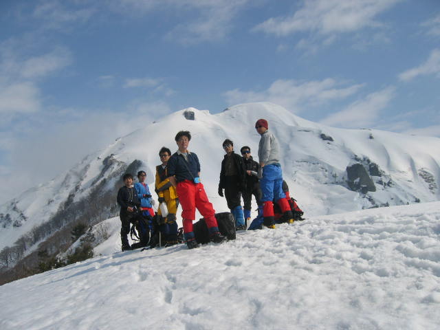 ![]() 頂上直下の雪壁をクリア、ロープをほどいてもまだまだちょっとした急斜面 の下りが出てきます。斜面に正対(登る向きになる)して下るのが正解!