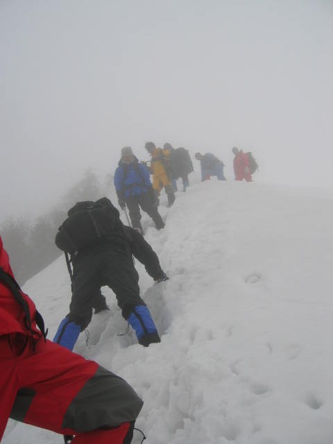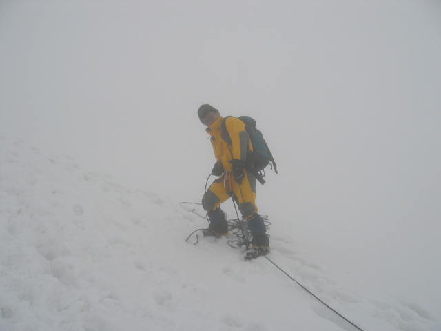 ![]() 悪天候が追いついてきました。視界がまったく無い中、ロープを出してスタンディングイアックスビレーで下ります。 、 |