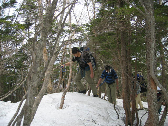 頂上より標高で100メートル下からは雪の道に変わりました。トレースはありませんでした。