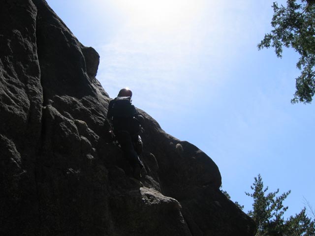![]() ガマスラブ上部の岩場のリードを始めるFさん。 、 |