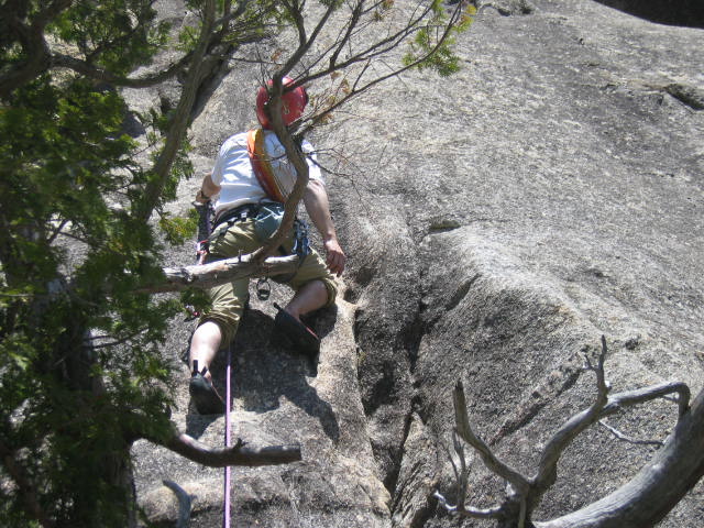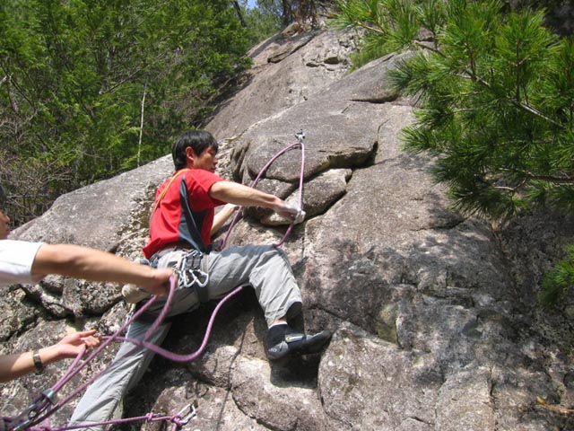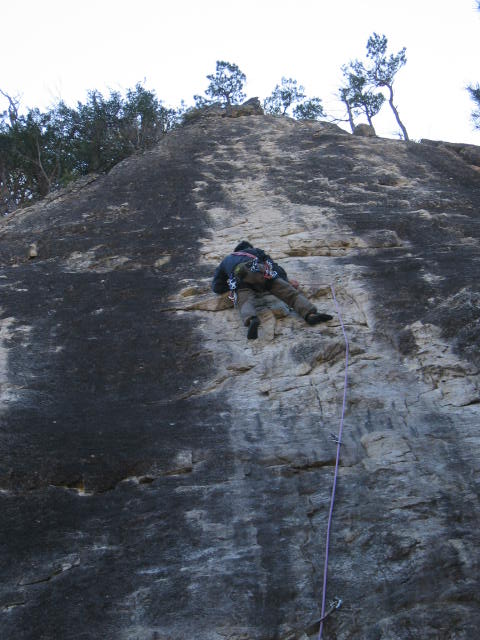 父岩の小川山ストーリーをリードするOさん。 カメラマンは車のガソリンの補充と買い出しのため廻目平にもどりました。他のメンバーは父岩の混雑を避けて母岩と妾岩のいくつかのルートで一日を過ごしました。 |