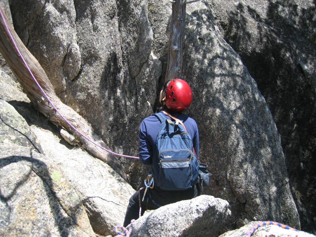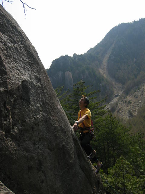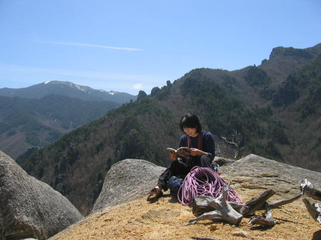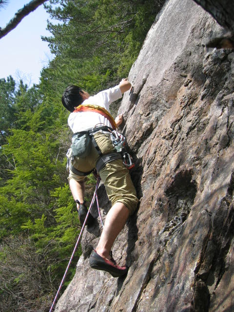 ![]() 5月2日夜に東京をマイカー2台で出発、廻目平着は3時でした。6時30に起きて、7時出発屋根岩U峰のマルチピッチルートのセレクションに向かいました。1ピッチ目、朝日に向かって登るMさん。 、 |