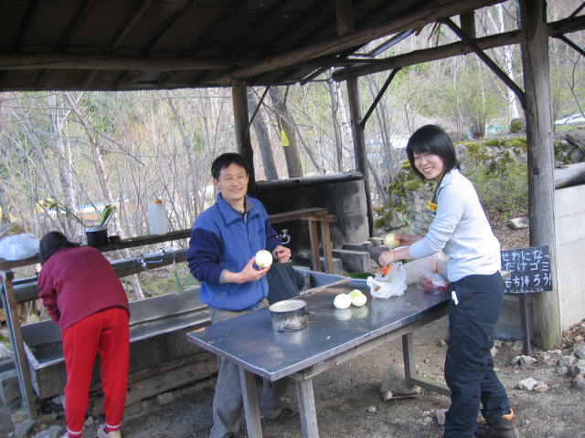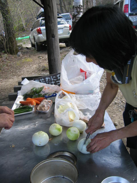 さっそく夕食作りです。メニューはカレーライス、焼き鳥ヨーグルト風味、トマトワカメサラダ、バラ肉焼き、野菜焼きなどたき火を生かした料理です。 、 |