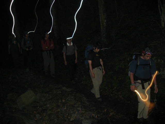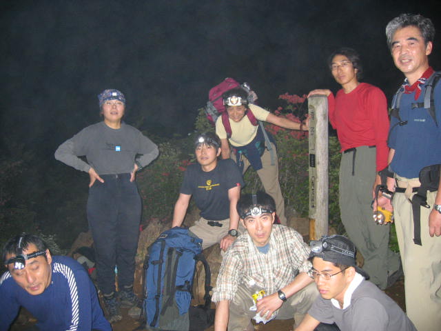 ヘッドランプをつけて歩きます。最近流行の発行ダイオードの白っぽい光はガスの透過能力が 低いので足下が見づらいです。重いけれど古い豆電球のオレンジ色の光のほうがフォッグラン プとしてはいいです。発光ダイオードの色をオレンジに変えられるような改良を待ちたいです。 、 |