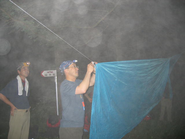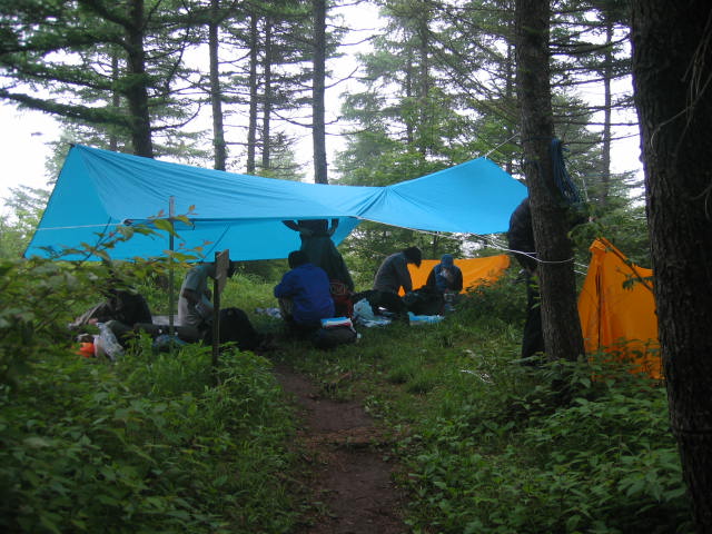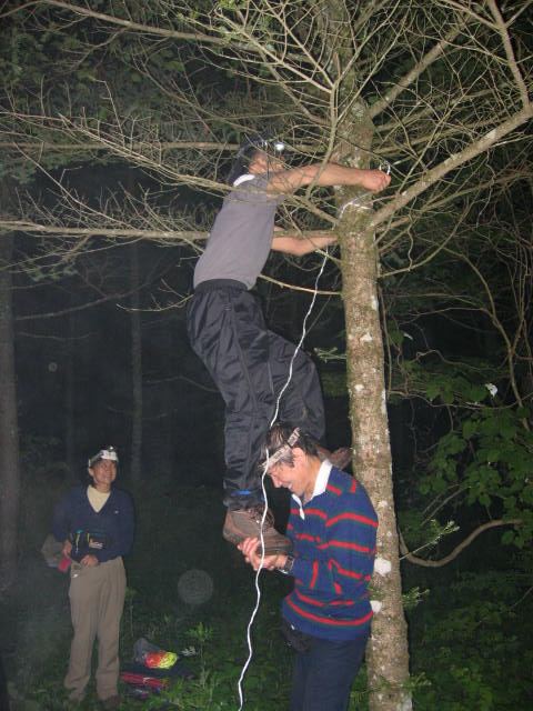 26時30分、大谷ゲ丸に向けての登山道の途中で広くて平らなキャンプ 地を見つけてタープを張るために、木に登って張綱を結んでいる所です。 、 |