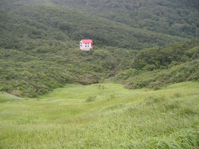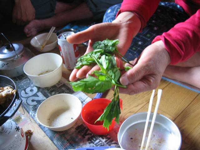 さらに2時間ほど歩いて金明水避難小屋に着、青森の山岳会(沢と山スキー主体の会)の人4人 が採って来たホウバ?という山菜をちょっとだけごちそうになる。他に単独行の自称写真家氏と 高知から来たご夫婦と我々3人の10人が小屋に泊まりました。出来たばかりのきれいな小屋で した(水場まで30秒、バイオトイレあり)。 、 |
