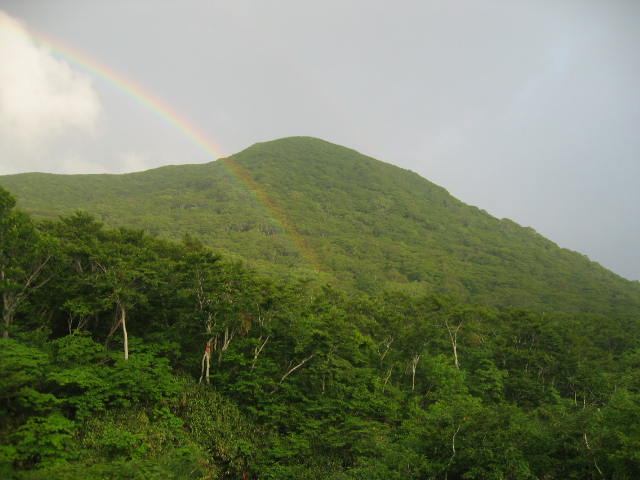 夕立がありました。雨が止んで、小屋の窓から天笠山にかかる虹を見ました。 、 |