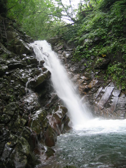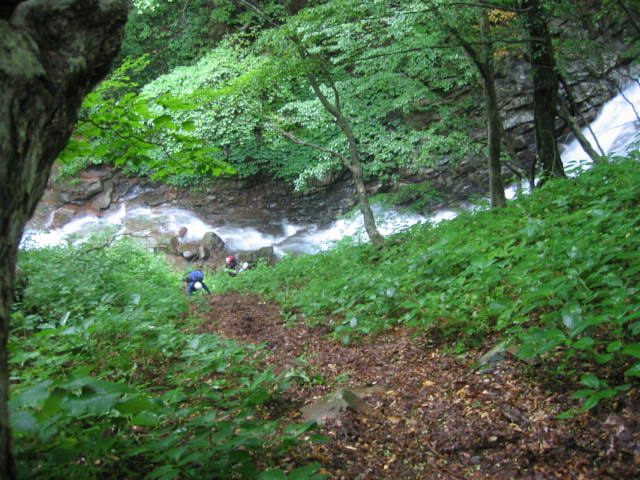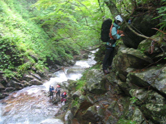 翌朝は6時に出発、水量が多くて手強いです。この滝の左上に鉄のはしごが見えるけど信用で きないのでロープを出して登りました。 、 |