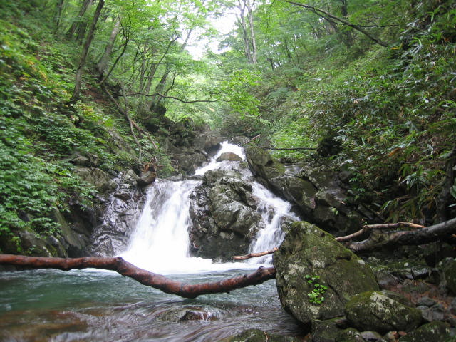 安達太良山表登山口にマイカーを置き、遠藤ヶ淵まで遊歩道を行き、遠藤ヶ淵の上の橋から入渓谷しました。すぐに20メートルほどのナメが表れます。ナメの右手(この写真の右上のあたり) に良好の幕場を発見してそこにタープを張りました。 、 |