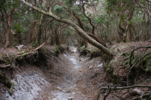 ![]() 万二郎岳〜万三郎岳間の登山道の様子です。 ちなみに、天城という名前の峰はなく、 この万二郎・万三郎を中核とした連山を総称して天城山と言います。 入山者が多いせいか、登山道はこのようにえぐれてしまっていますが、 傾斜は終始緩やかで、大変歩きやすい道です。 、 |