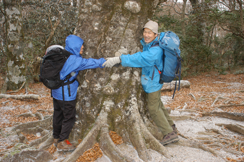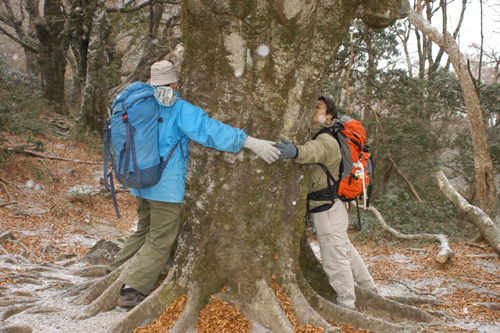 ![]() やはり万二郎〜万三郎間にあったブナの巨木で、 メンバーが手をつないで大きさを体感しているところです。 登山道はブナ・シャクナゲ・ヒメシャラ・アセビなどが生い茂る 豊かで素敵な森の中をゆったりと進んでいきます。 、 |