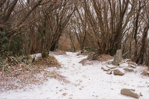 ![]() 万三郎岳の山頂です。 案内板の隅に丸文字風のかわいい山名標がありました。 とうとう雪が降ってきました。 まだ降り積もるほどではありませんが、 登山道がかなり白くなっています。 、 |