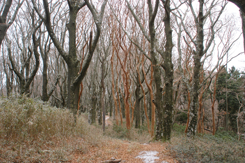 ![]() 曇り空の下でも登山道の雰囲気の良さがおわかりいただけると思います。 M講師やEさんなど年配のメンバーは、 天城にまつわる文学の香りを思い起こし、 恋人と語らいながらの登山を夢見た若き日のことを語り合っています。 中央付近の赤い幹がヒメシャラです。 、 |