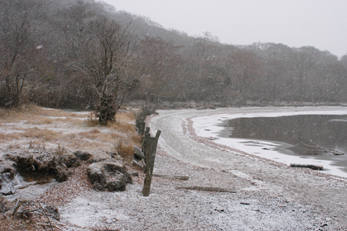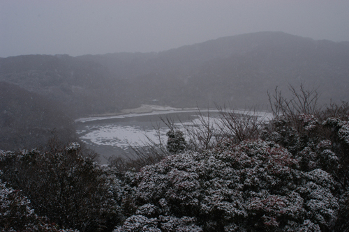 ![]() 見晴台から見下ろした八丁池です。 名前の通り、森の上に突き出るように建てられた 鉄製の見晴台の上から撮りました。 晴れていれば富士山を始めとする大展望が得られるようですが、 残念ながら降りしきる雪で手近な部分しか見晴らしはありません。 、 |