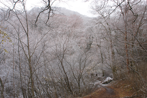 ![]() 冬木立に雪がついて花が咲いたようです。 一瞬、雲間から太陽がまんまるの盆のように見えたのですが、 間もなくかげってしまいました。 雨の予報、時期的に山中は雪になってもおかしくないのは わかりきっているはずなのに、うかつにも予想もしていませんでした。 でも、そのおかげでこんな素敵な景色にめぐりあえました。 雨だったら撤退してただろうね、ってみんなで話し合いました。 、 |