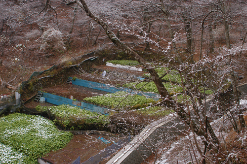 ![]() 登山道途中のわさび田です。 雪の花が咲いた冬木立の中で、 わさびの青々とした緑が目に鮮やかでした。 観光道路からさほど離れていないせいか、 盗まれないようにしっかり柵がしてありました。 それにしても緑を「あお」という日本語って不思議ですね。 、 |