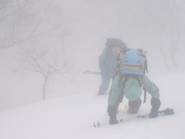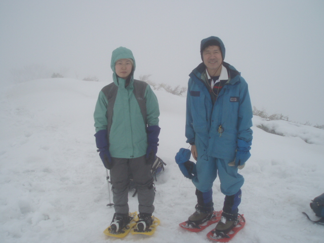 @ 「タカマタギ山頂」 − 雪がだいぶ締まっていたのでワカンにしようか思案の結果、今回はスノーシューにしました。昨年は膝まで埋まるラッセルと東南東のやせ尾根に泣かされましたが、今年は北東稜から山頂に達しました。一面乳白色のガスで何も見えませんでしたが気持ちは充実しています。 , |