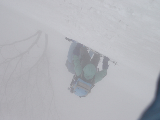 A 「山頂直下下降」− 写真では判りにくいですが頂上直下は、60度はあろうかという急傾斜。 スノーシューを履いたままなので斜面に正対して降りる方が確実と判断しました。 , |