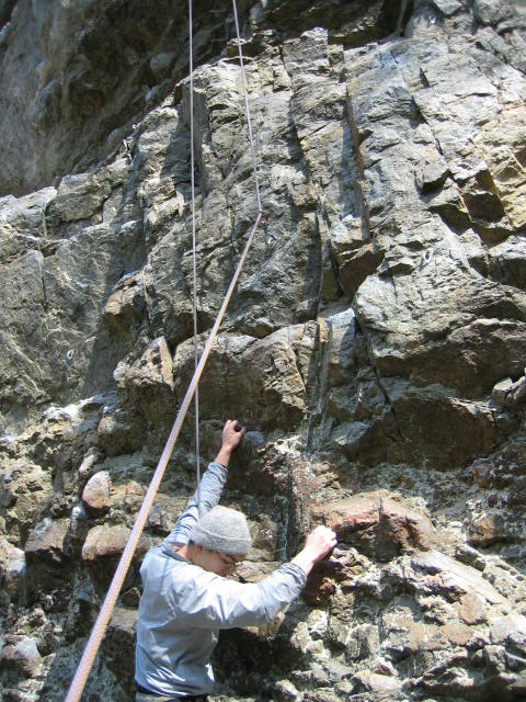 ヌンチャク(クイックドロー)をはずしながらロワーダウンしたのですが、一番下とその上のヌンチャクは回収せづに残しました。はずした時に大き振られるなどの危険があるからです。写真は 再度登りかえして、残したヌンチャクを回収しに行っている所です。 、 |