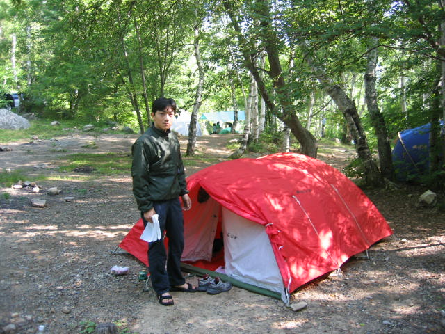 深夜10時に流山を出発、廻目平キャンプ場早朝3時着、すぐにテントを張って寝てしまい、朝7時に起床しました。M岡講師はまだちょっと眠そうです。 、 |