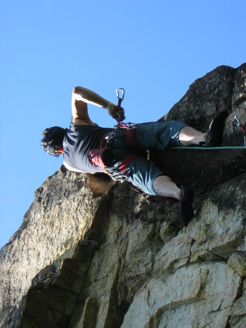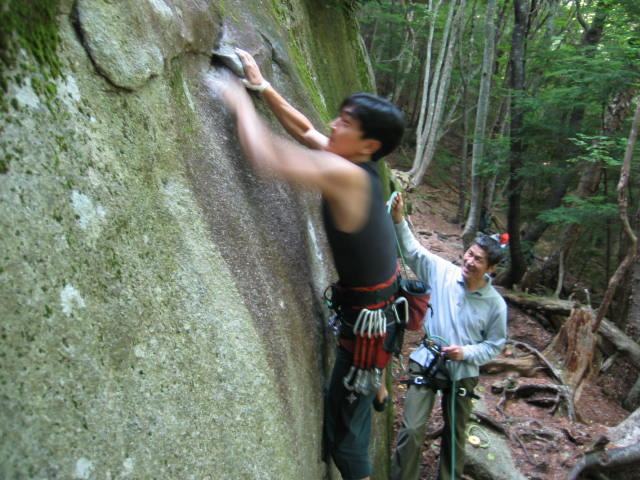 ロワーダウンで降ります。その後、スラブ状岸壁で「かわいい女5.8」出だしの一歩だけむずかしい を登ってから父岩に移動、定番の小川山ストーリーを登って廻目平を後にしました。 、 |