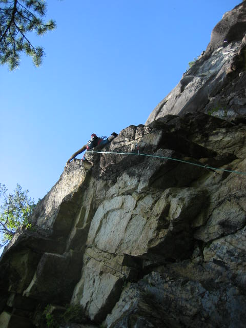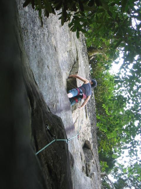 リバーサイドエリアで、ブラックシープとジョコンダ5.10dとアウトオブバランス5.9を登ってから スラブ状岸壁に移動しました。スラブ状岸壁の最下部から右に5メートルほど行った所にお 得イレブンと言われている「水曜日のシンデレラ5.11a」があるはず。でそのシンデレラに取 り付いたつもり(でもこのルートは帰京して照合した所、水曜日のシンデレラとは違いました。) 、 |