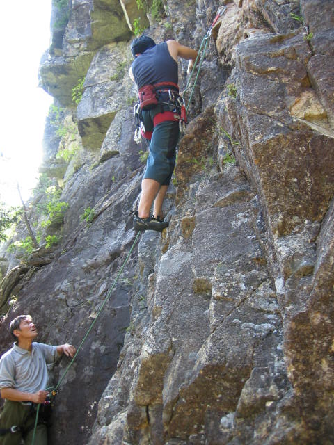 テント場から10分の所にリバーサイドエリアがあります。ガマスラブに行くより近いけど川西股沢を渡渉せねばなりません。ブラックシープのバリエーション5.10aを登り始めるM岡講師。 、 |