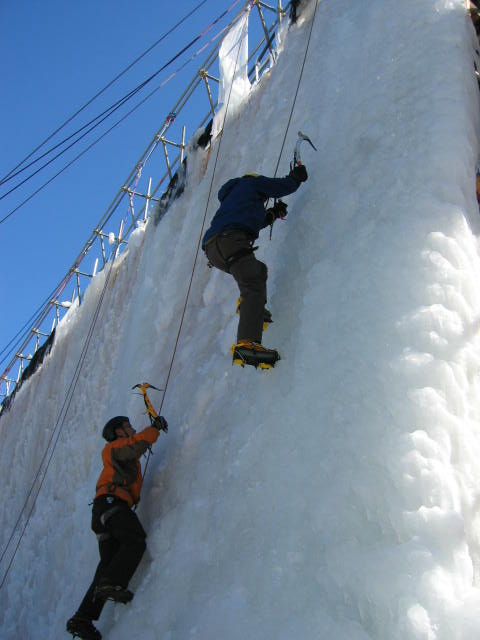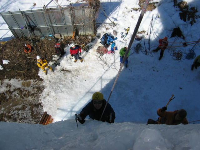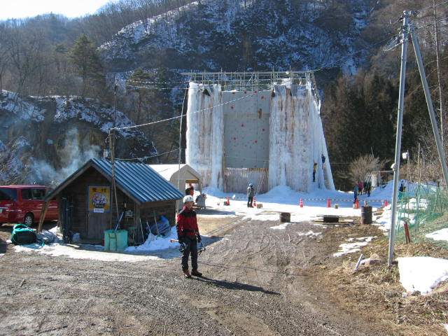 西側の緩斜面の氷を登ります。下から水を吹き付けて凍りを作っているので、つらら状でなくて テーブル状に凍っていて自然の氷とは感触が異なります。 , |