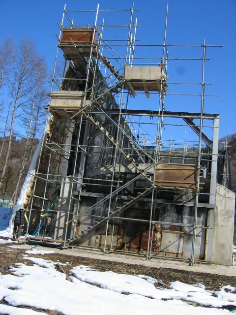 2007年は暖冬で群馬県のアイスクライミングエリアはほとんど氷のない状態でした。それで、六合 村(クニムラ)に出来た人口のゲレンデのアイスエクストリームに行くことにしました。場所などは アイスエクストリームでWeb検索すればわかります。正面(北側)ではミックスクライミングが出来ます。ちなみにエクストリームとは「極端」という意味です。 , |