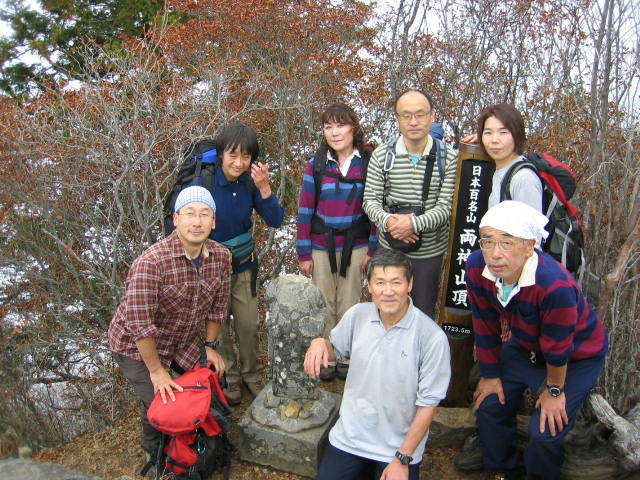 両神山の頂上で、バリエーションの尾根から来たH講師(後列右から二人目)と出合えました。 、 |
