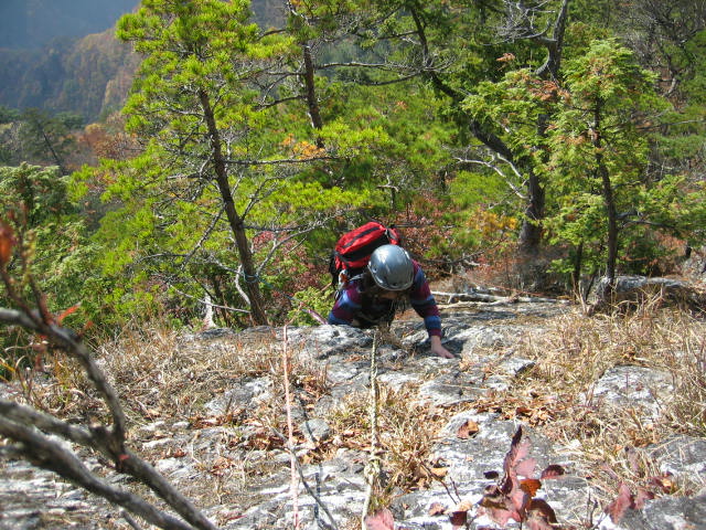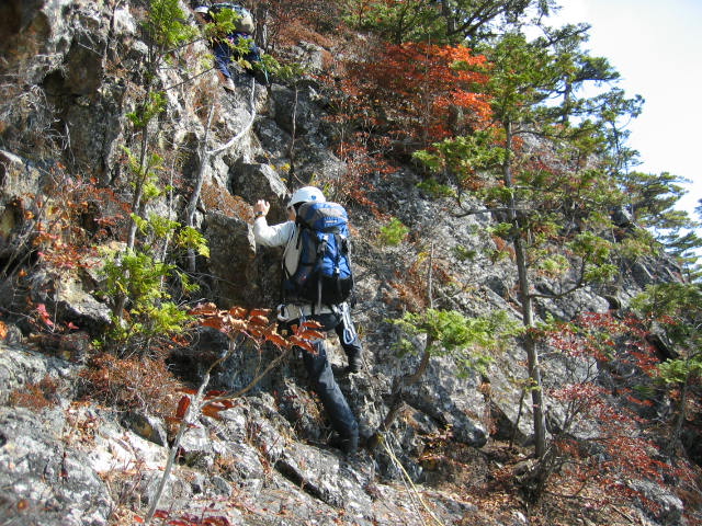 11月5日 赤岩山・赤岩尾根に向かいました。P2を登攀中のHnaさん。 、 |