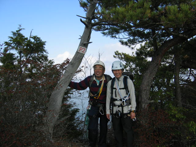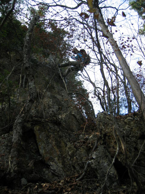 P1にあった残置ハーケンとそれにかけられたトラロープが信用できないので 懸垂下降しました。そういえば、P2にあった残置ロープの支点は枯れ木でした。 ルート上にあるたくさん残置のロープには不用意に体重をかけない方が良いです。 ちなみに、ルートには目印の赤テープや赤ペンキが多くあってわかりやすくなって いました。その分ルートファインディングの面白さが減ってしまい残念です。 、 |