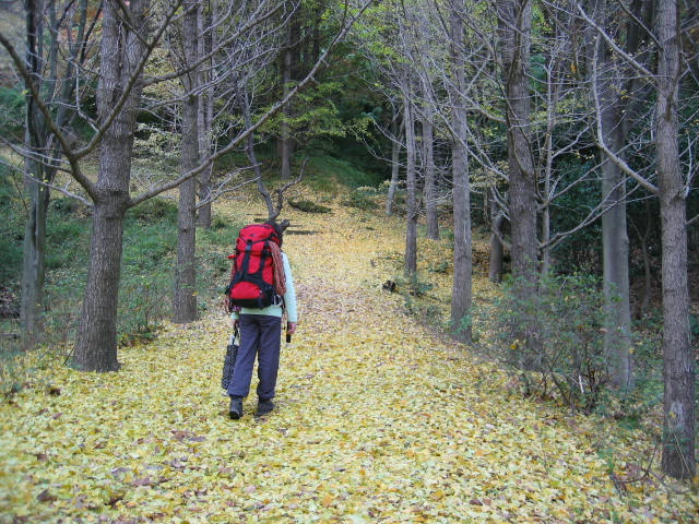 銀杏(いちょう)の落ち葉に敷き詰められた道を登って行く。銀杏の黄色や楓の紅が美しい。 , |