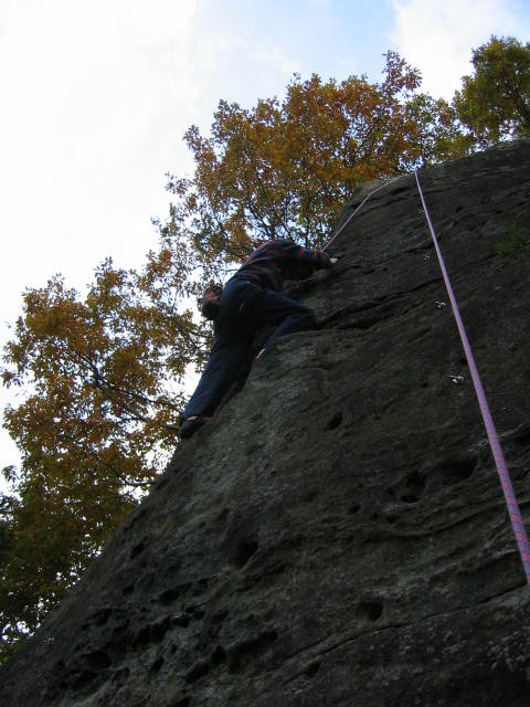 「菊のテンプラライト5.9+」をジタバタと登るM浦さん。右のロープのラインが「春らんまん5.9」 です。ロープの左に連打されているボルトラインに注目して下さい。「春らんまん」は初心者が リードで登れるようにボルトが打たれているのです(10メートルで7つ)。この岩場の開拓者た ちのルート整備の目が後輩を育てる方を向いていることがよくわかります。岩場の下の広場 の整地も見事で、心がこもっているのがわかります。 、 |