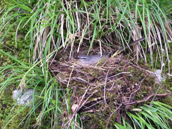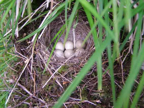 見ると、傷ついている様な素振りを見せます、これは擬傷(傷をしていて飛べないように翼を引きずって歩き回り、人の注意をそのほうに向ける)だなと、思い真正面の岩に目をやると、六個の卵が入った巣がありました。