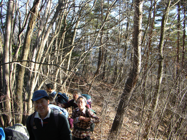 ![]() 林業の仕事道を拾いながら斜面を詰め上げ、尾根上に出たところで、もうすっかり 冬模様です。日だまりと言いたいところですが、季節風が来ると震え上がるような寒 さでした。 , |