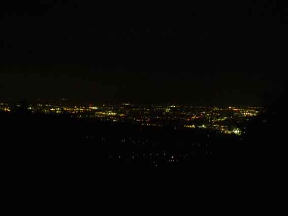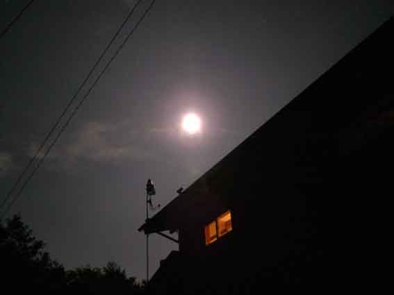 夕方になると雷が鳴り、雲も多くなってきました。それでも、少しの期待をもっていた ので良く見えるように、山裾のほうに移動しました、やはり、空は雲が多く、遠くで雷 が鳴っているのがわかりました。月の位置さえわからないほど曇っていましたので、 うちに帰ろうとしました、藤沢橋に来た時、皆既月食になった満月が見えました。そ れから、嘘の様に晴れ渡り、もとの満月に戻るまで見る事が出来ました。(東京方 面は雷雨が凄かったらしいですね。) |