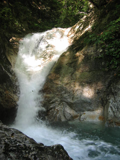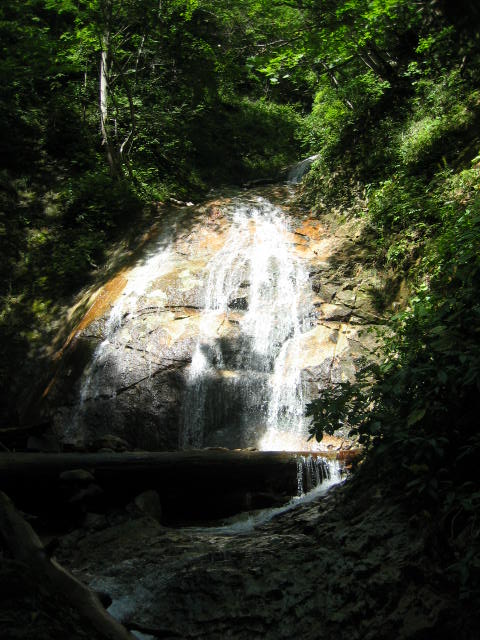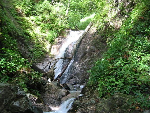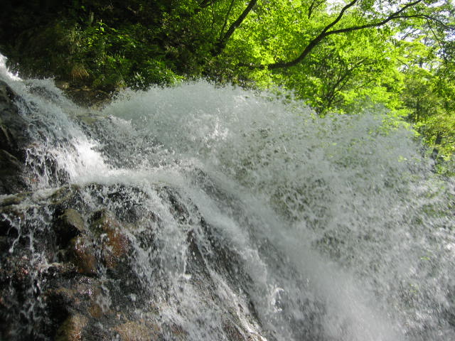 吹き上げるうに激しく落ちる滝の水は遡行者を威圧する。 , |
