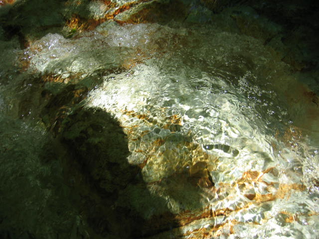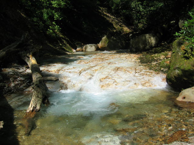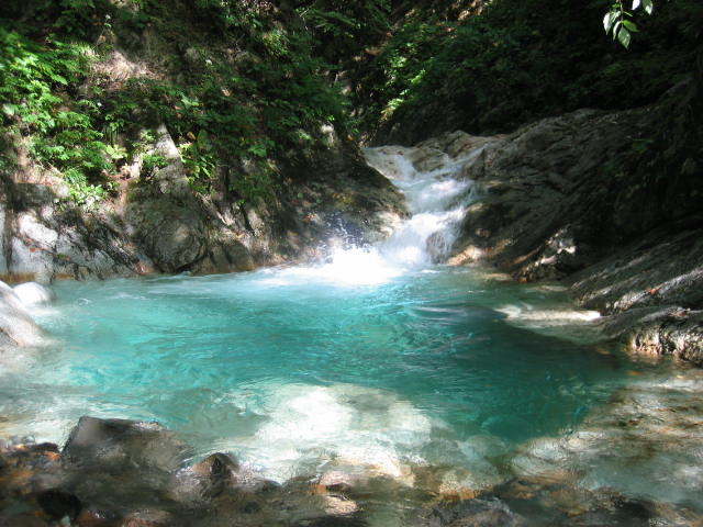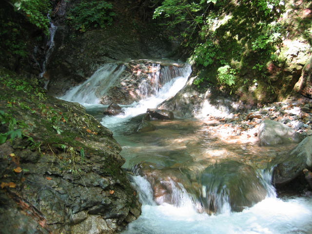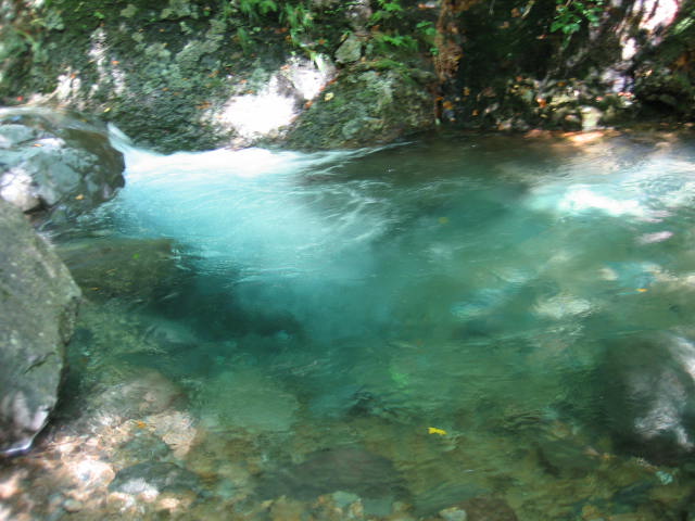 青空の下、澄んだ水が多量にあって沢の美しさが増していた。 , |