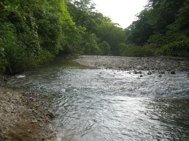阿武隈川を遡ること1分で右から南沢が入って来る。南沢の出会いは素敵なテント場だ。 魚も釣れそうだ、焚き火も宴会も出来る、でも、甲子温泉手前の駐車スペースで車の隣に テントを張る方を選んだ僕ら、歳をとったんだなー。 , |