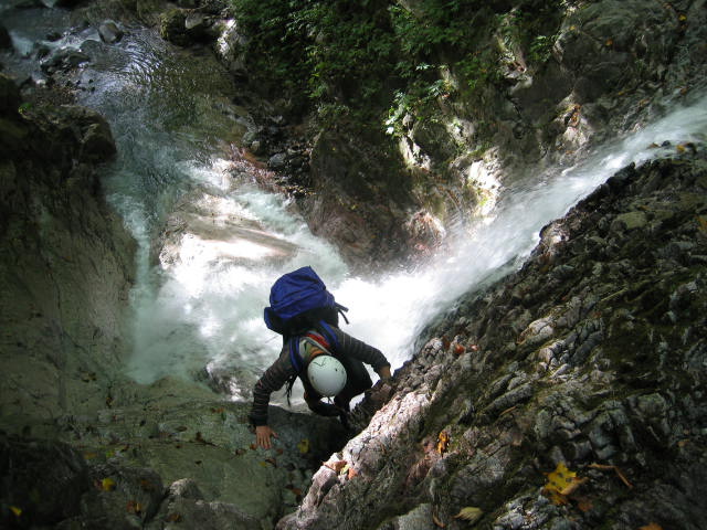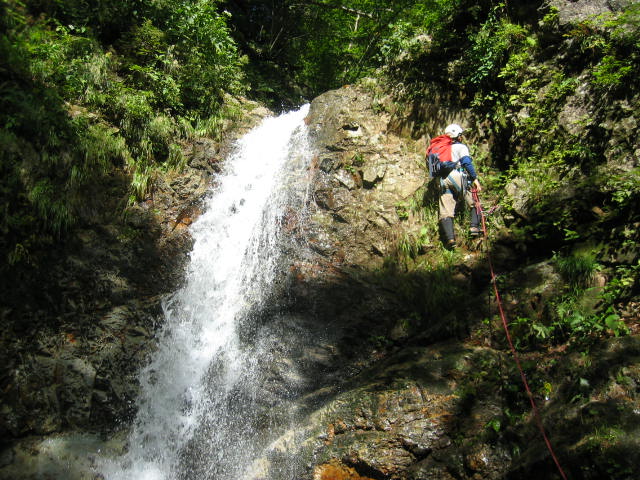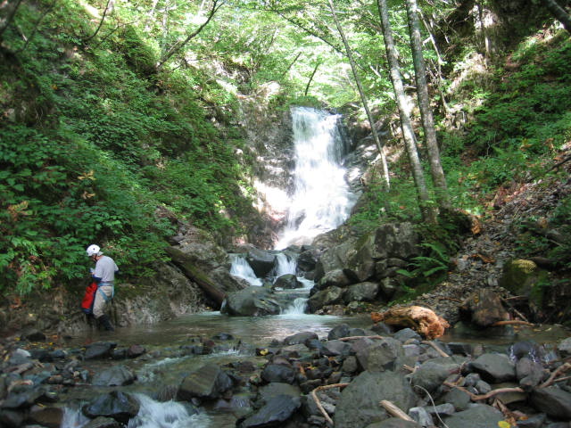 南沢は10メートル以上の滝が10ほどある登攀的な沢だ。残置のプロテクションが少ない 上に、水量が多いので滝の直登は緊張の連続。半分、巻いた滝が2つ。 , |