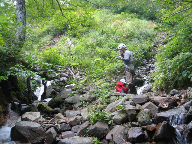 奥の二俣は水量の少ない右の沢に行くことにした。ガイドブックは左の沢を取っている。 , |