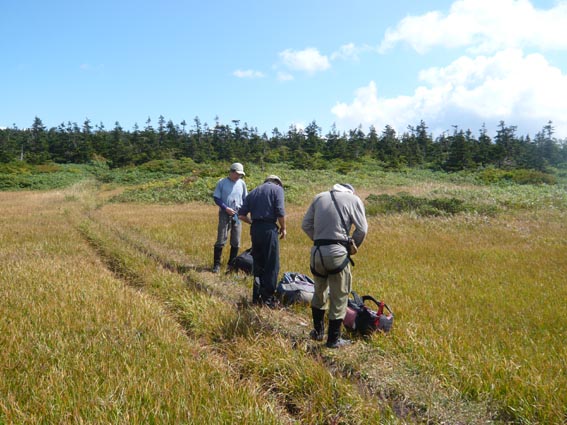 ![]() 翌朝、暗い内に出発、湿原を下り関東沢をとらえた。 、 |