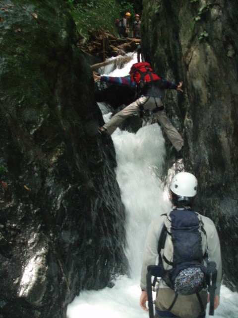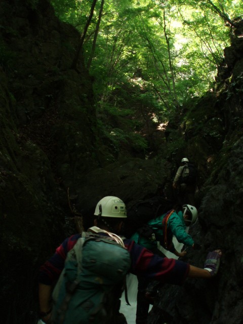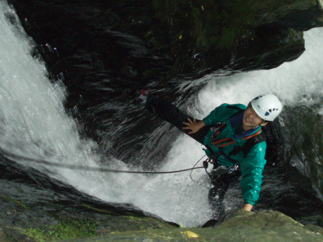 逆川1、F1、11メートル2段の滝(下部3メートル、上部8メートル)の下部を登る。上部はピンが見当たらず高巻いた。が、高巻きルートにあった残置ハーケンもガタガタだった。 , |