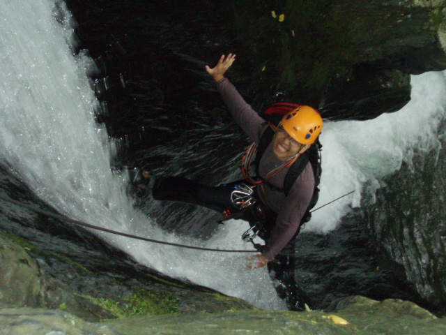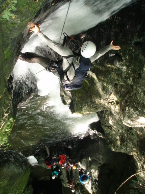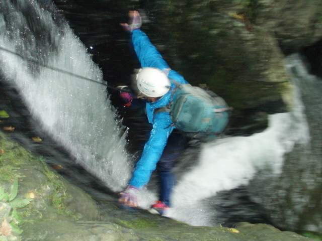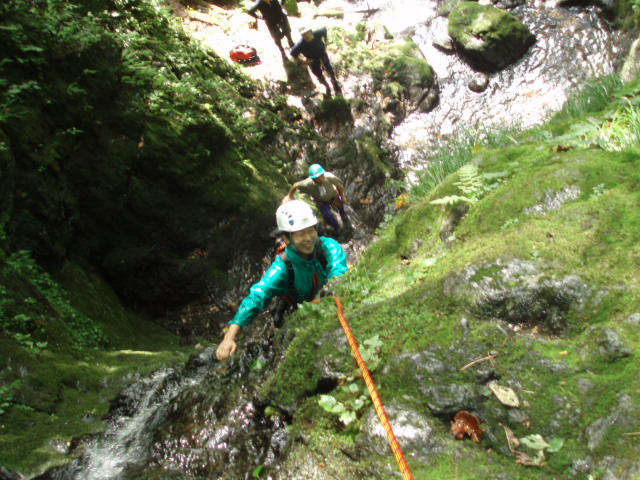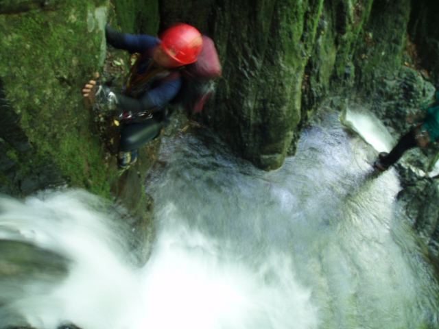 水根沢3、この沢最大のお楽しみ半円の滝。写真は逆さまですが、登っている人の感覚はこんな感じです。 , |