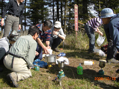 ![]() 頂上できのこ汁を作りました。 料理と食事に夢中で写真 ほとんどなし。 きのこはイグチです。イグチの仲間にはたくさんの種類があって、どれも毒がなくてはツルンとした食感じでおいしいです。でも、時々アクの強いイグチに出合います。毒のあるイグチもあるらしいという話しも聞いています。食べる時は慎重に。 |